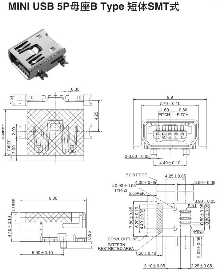 MIMI USB 5P母座 B Type 短體SMT式