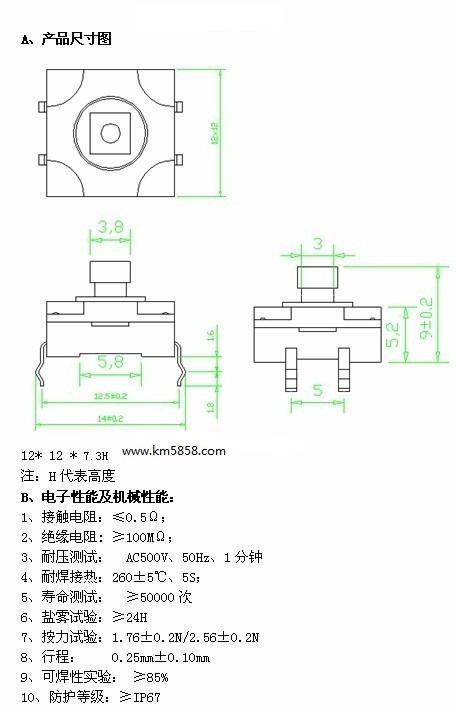 詳細介紹: 防水輕觸開關KM1212插腳 本產品廣泛用于,玩具,電動玩具,玩具公仔,防盜器,家用電器,手機數(shù)碼,電子通訊,電子游戲機,汽車防盜,智能化系統(tǒng),電視機、MP3、耳機,等電腦通訊器材